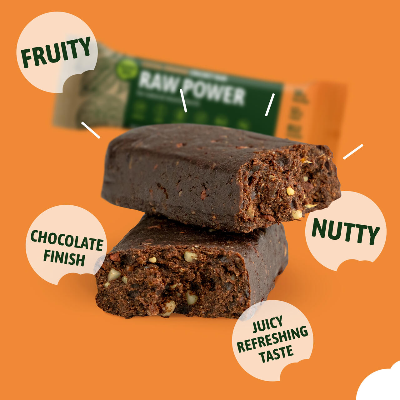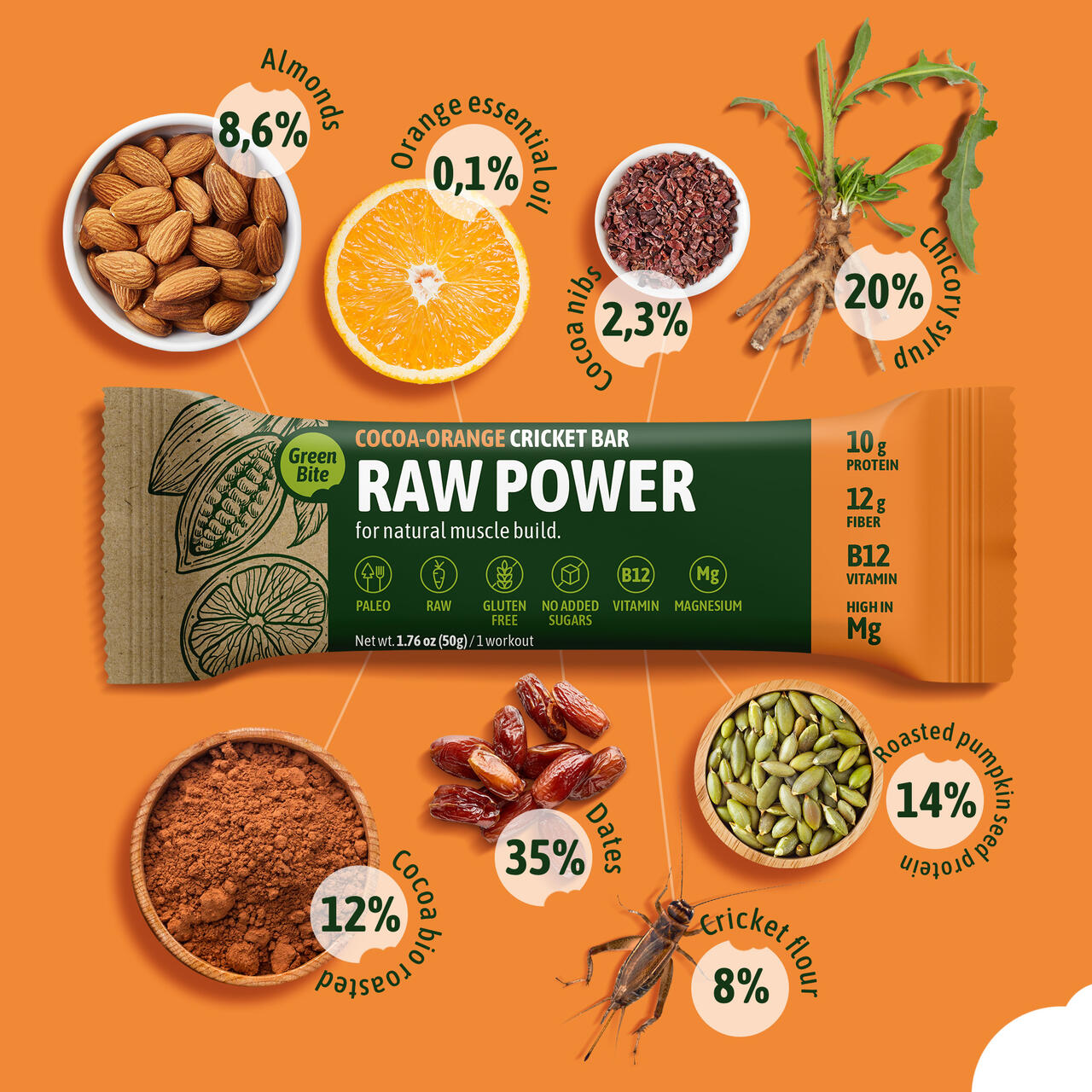 Koostisosad: mandlid: 8,6%, röstitud kõrvitsaseemne valk 14%, datlid 35%, siguri siirup 20%, kilgijahu 8%, röstitud kakao 12%, toorkakao tuumad 2,3%, apelsini õli 0,1%