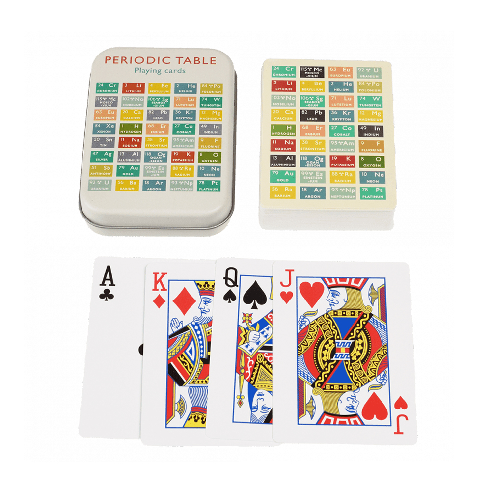 Unikaalne perioodilisustabeli kujundusega mängukaardid, mis on pakitud tugevasse metallkarpi. Kaardid on vastupidavad ja sobivad mängimiseks kodus, sõpradega kogunemistel või reisile kaasa võttes, tuues mängulusti igasse hetke.