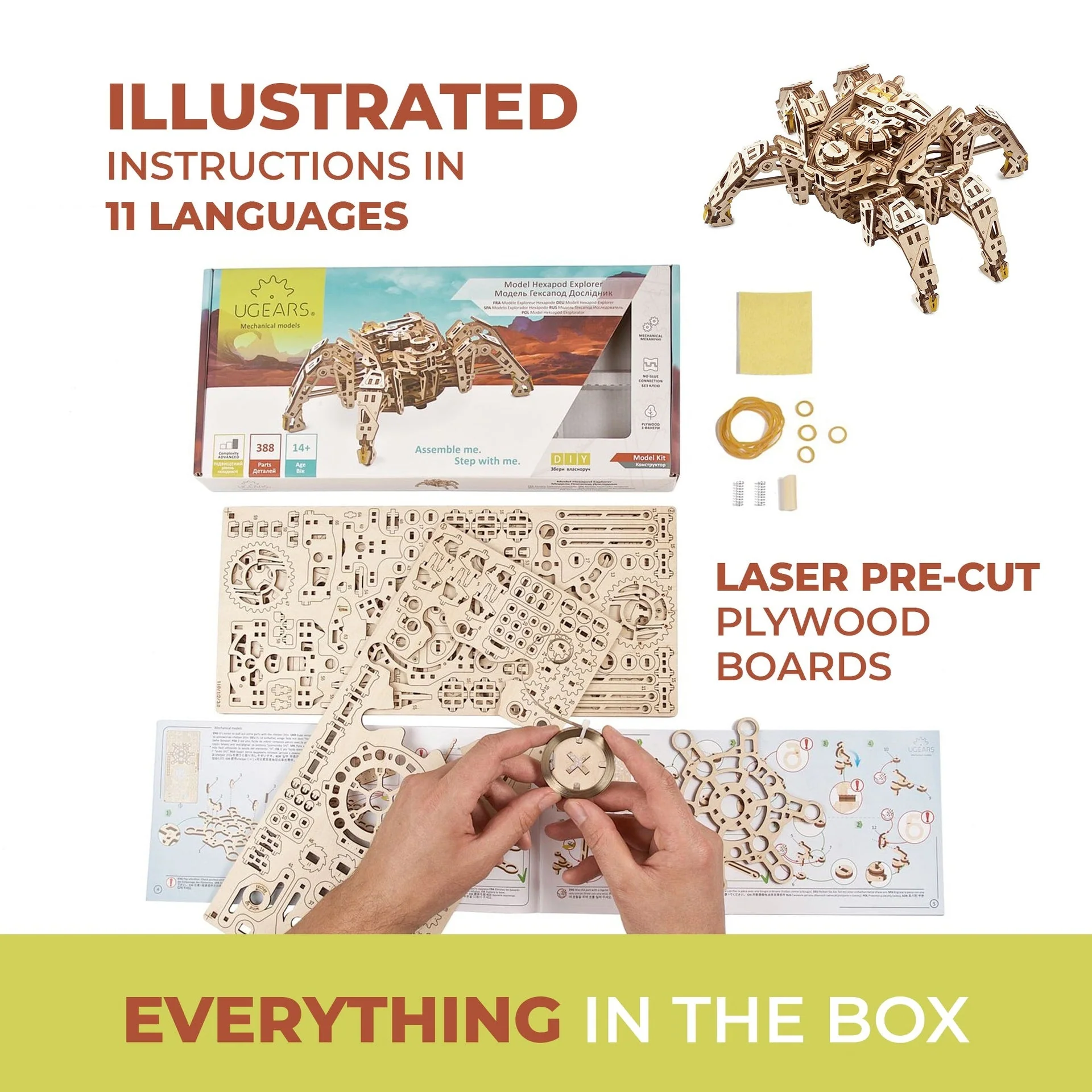 Pane kokku vahva kuuejalgse uurija mudel! Mudel ei vaja liimi või muude tööriistade kasutamist ning valmis osasid saab lihtsasti puidust raamistikust välja võtta. Komplekt sisaldab kõike, mida monteerimiseks vaja on. Kaasas on kasutusjuhend. Mudel on valmistatud looduslikest keskkonnasõbralikest materjalidest ja sellel on meeldiv puidu lõhn. Monteerimisprotsess on lihtne ja lõbus!
